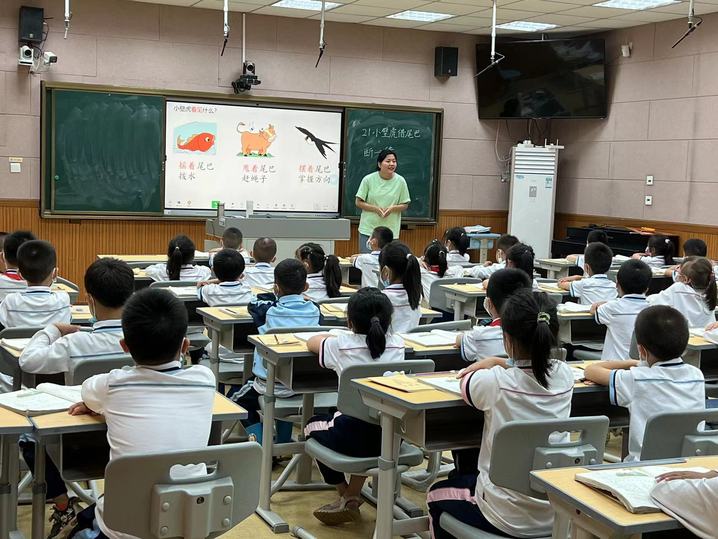 接着是由一年段刘晓玉老师带来的《小壁虎借尾巴》,以连环画导入课堂,成功吸引了学生的学习专注力。图文并茂的课件,富有童真童趣又不喧宾夺主,引导学生在观看图片、视频的基础上,聚焦文段,思考小壁虎借尾巴的原因。刘老师不仅落实了字词学习的语文要素,而且将本文转变成十分有趣的连环画,引导学生习得口语表达。